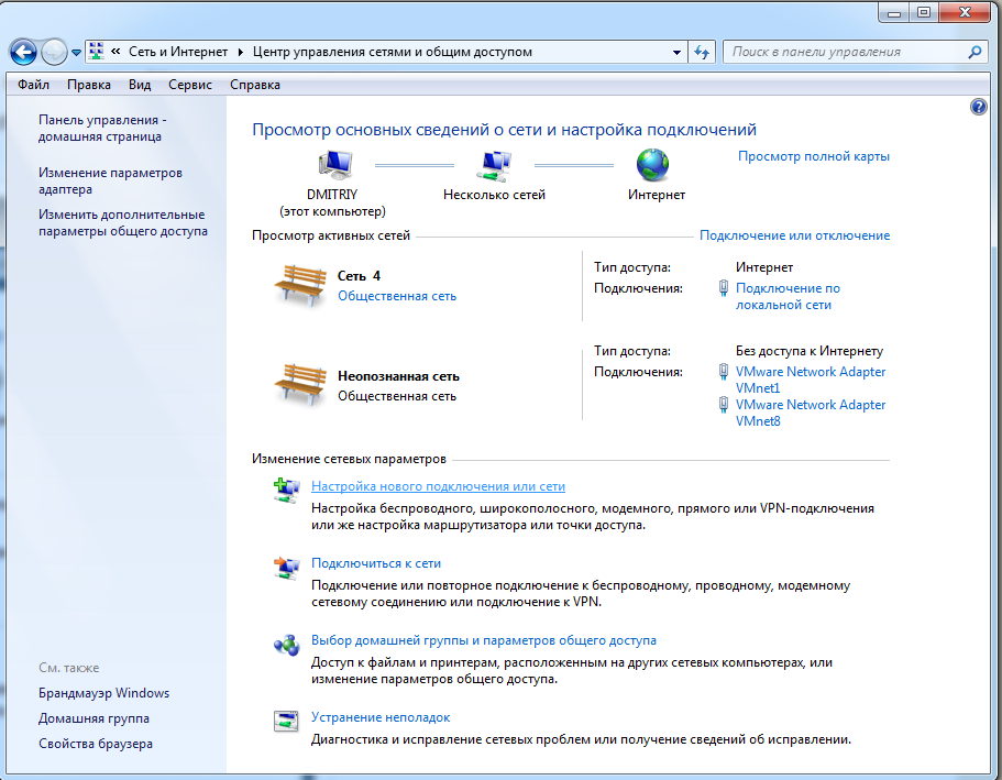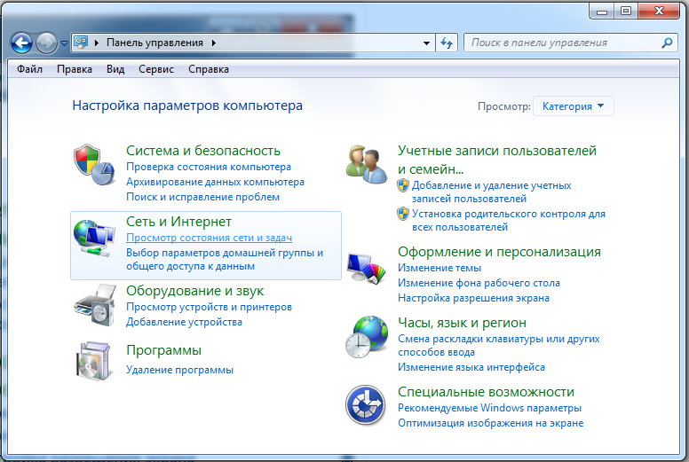 1. "Пуск" - "Панель Управления", выбираем раздел "Сеть и Интернет", нажимаем "Просмотр состояния сети и задач"