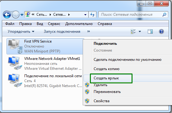 9. На созданном нами соединении кликаем правой клавишей мышки и выбираем "Создать ярлык"
