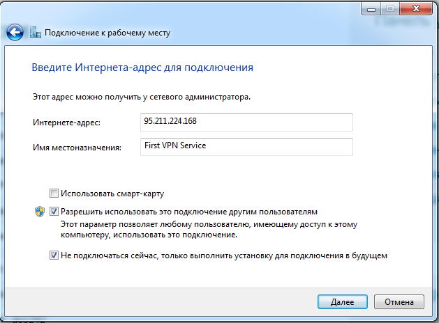 5. Указываем IP адрес VPN сервиса, который мы получили после создания подписки, а так же пишем название. Ставим галочки, как на скрине
