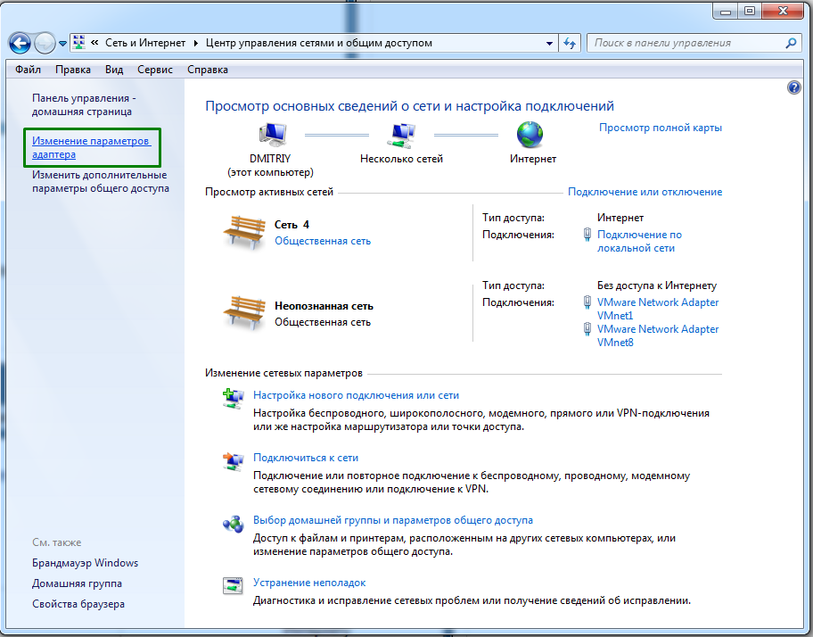 8. В "Центре управления сетями и общим доступом" выбираем "Изменение параметров адаптера"
