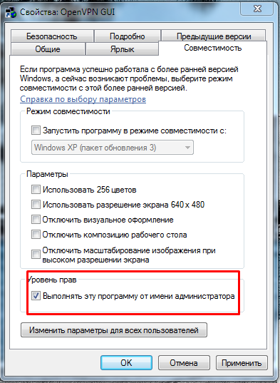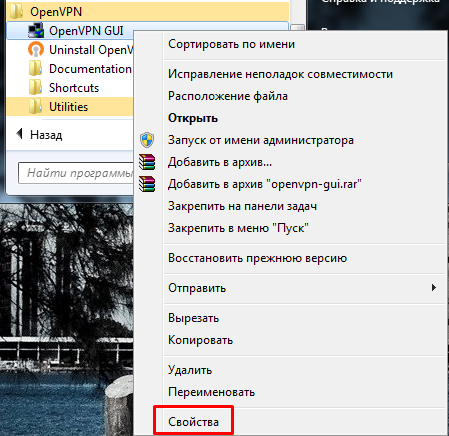4. Пуск - Все программы - OpenVPN - OpenVPN GUI. Нажимаем правую клавишу мышки и выбираем "Свойства"